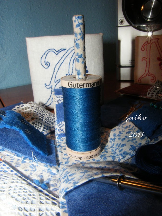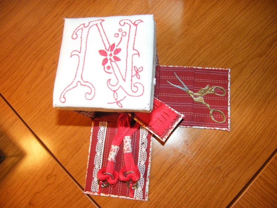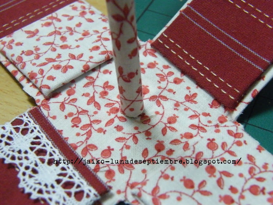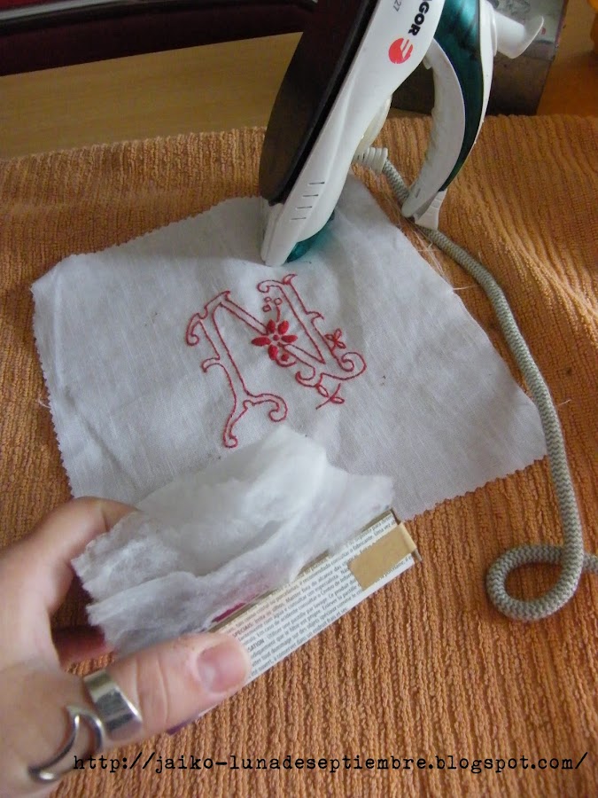 para pegarla hacemos una cruz y vamos pegando los bordes, 1º por fuera y después por dentro, yo he decidido bordar en redwork unas iniciales, pero podéis hacerlo con una tela que contraste, con lino etc.