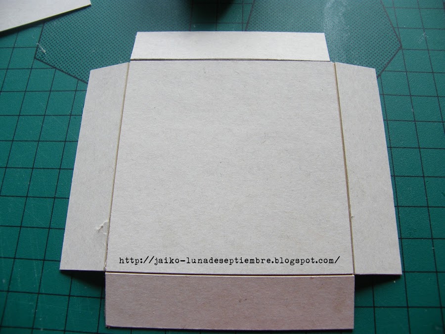 1) Aquí veis las piezas que forman la parte exterior del costurero, la del centro es de 8,5 x 8,5 y las de los lados de 10 x 8,5, las ponemos como en la foto y las pegamos con cinta adhesiva de papel dejando un espacio como de 1 mm para luego doblar bien.