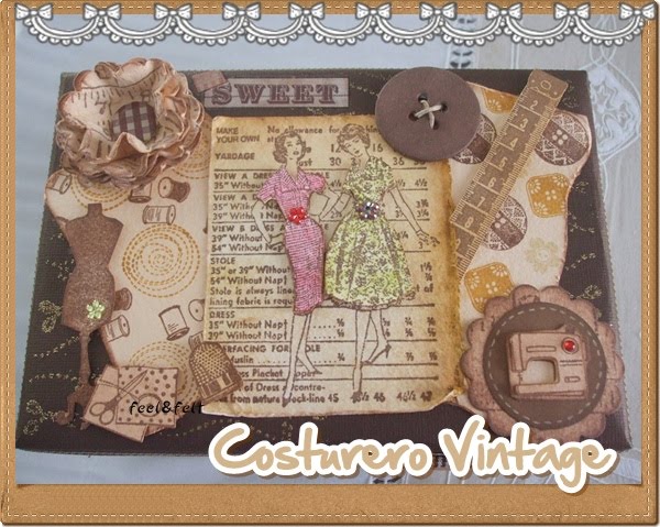 Se trata de un costurero vintage, elaborado en su mayoría con sellos, tanto por la parte exterior como interior.