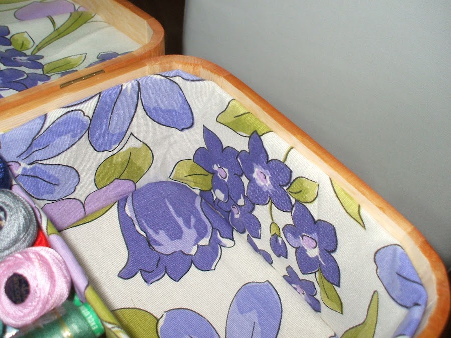 A continuación tomamos un cartón grueso de embalaje y sacamos una plantilla del interior de la caja, la cual forraremos con una tela que nos guste y con cola de madera la iremos pegando alrededor por el interior de la forma que vemos en las fotos.