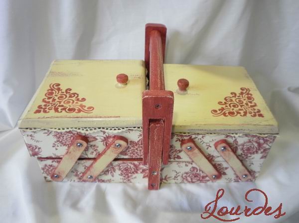 Este costurero está realizado en decoupage, decapado y estarcido con plantilla en las esquinas de las tapas