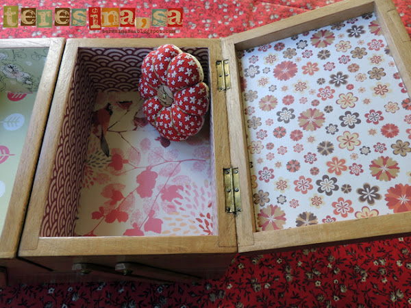Por dentro lo he forrado con unos papeles de scrap de estilo japonés y he hecho un alfiletero que es imprescindible.
