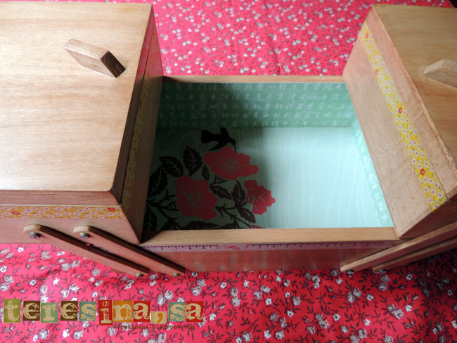 Per dins l"he folrat amb uns papers d"scrap d"estil japonès i he fet un coixí per les agulles que és imprescindible.