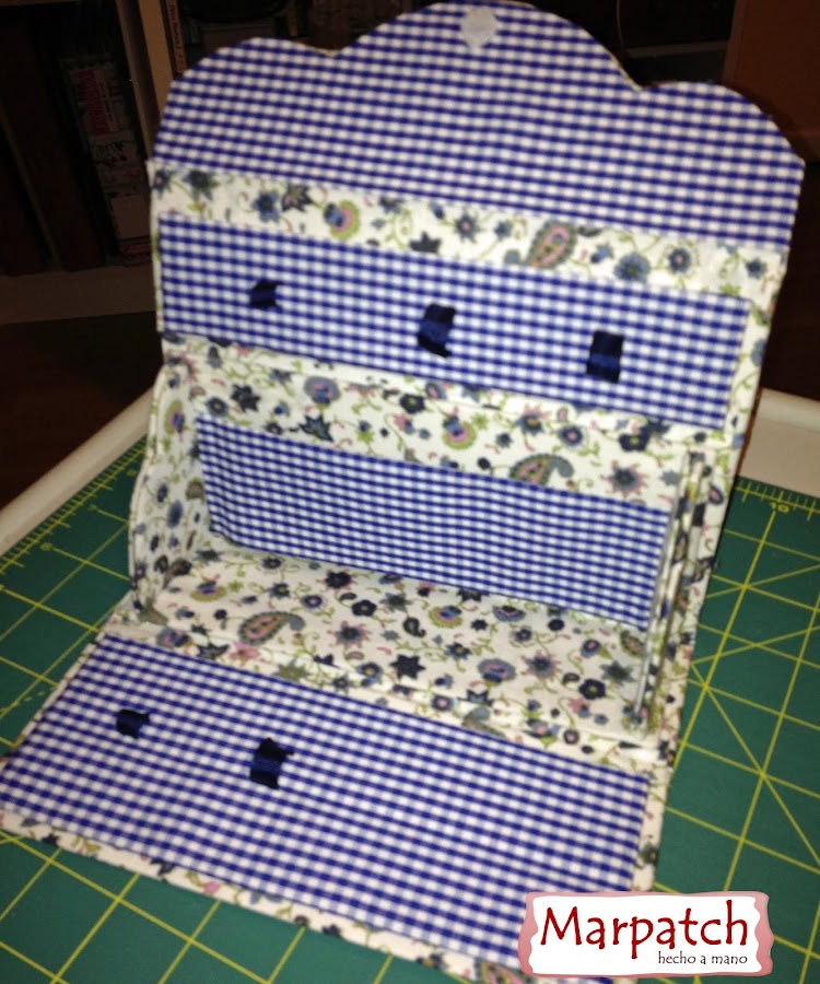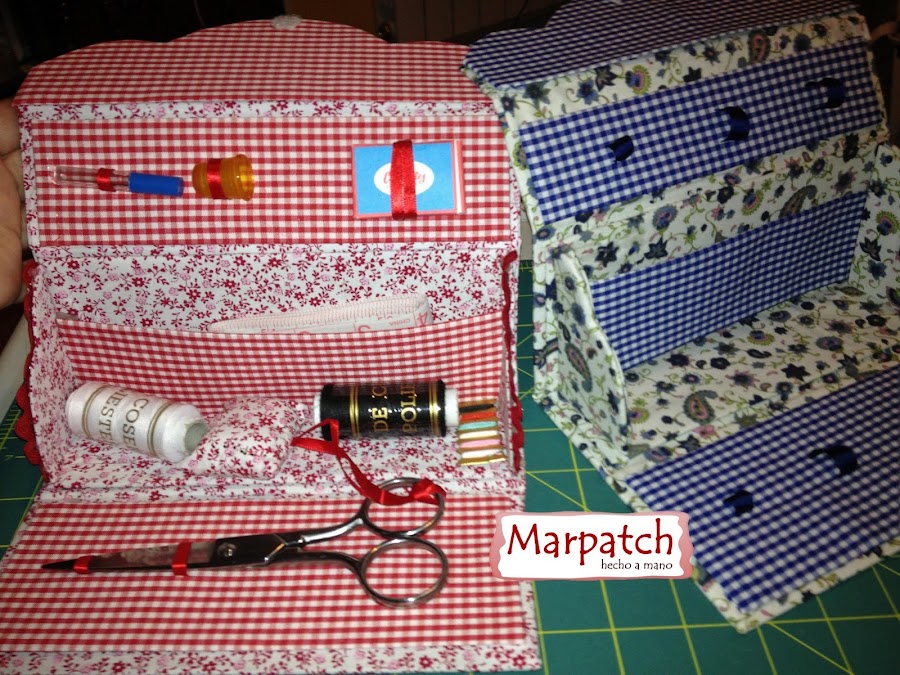 Costureros realizados en cartonnage con dos telas diferentes, son muy bonitos para regalar, para llevar de viaje o para las que necesitan pocos instrumentos para coser, se venden terminados o en kit para que lo montes tu misma, es muy fácil de hacer.