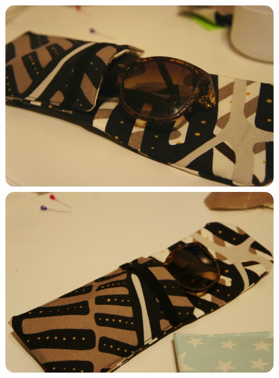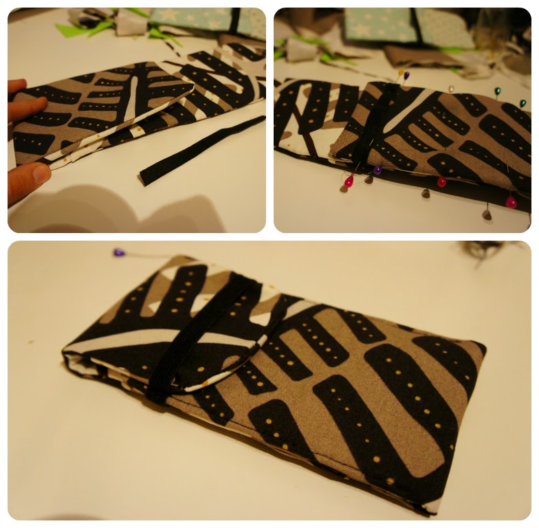 B) Corta la tela según las medidas del móvil/tablet/gafas de sol/lo que sea... y cose de modo que quede una abertura por donde luego podamos introducir la placa de foamy: