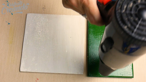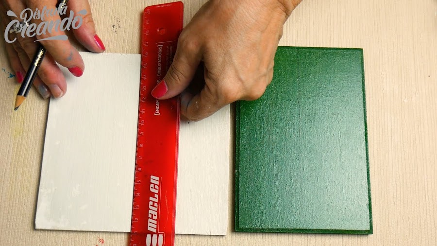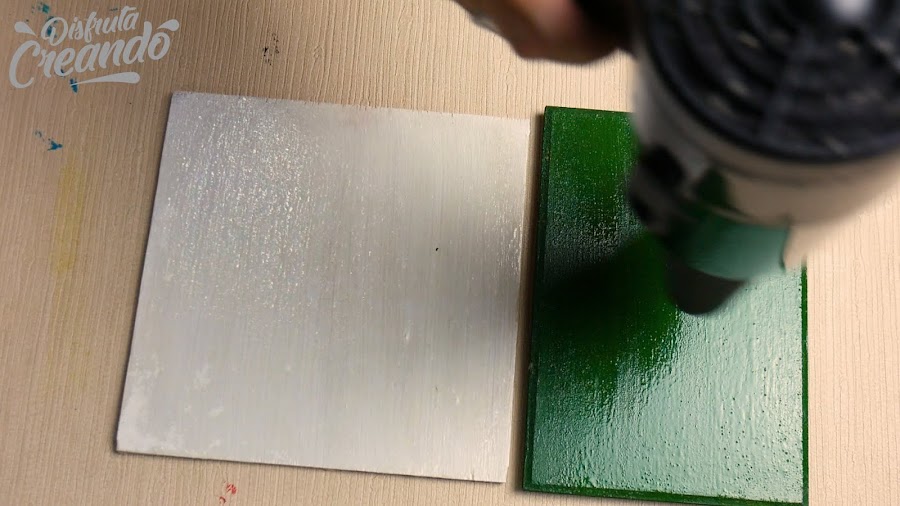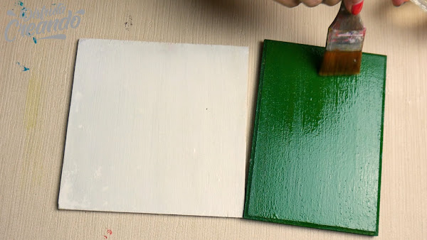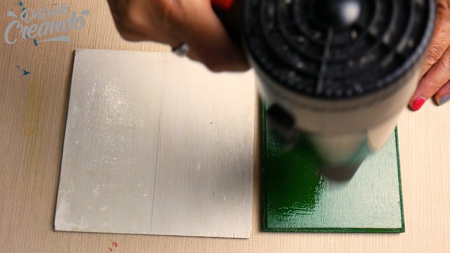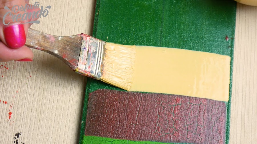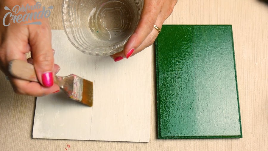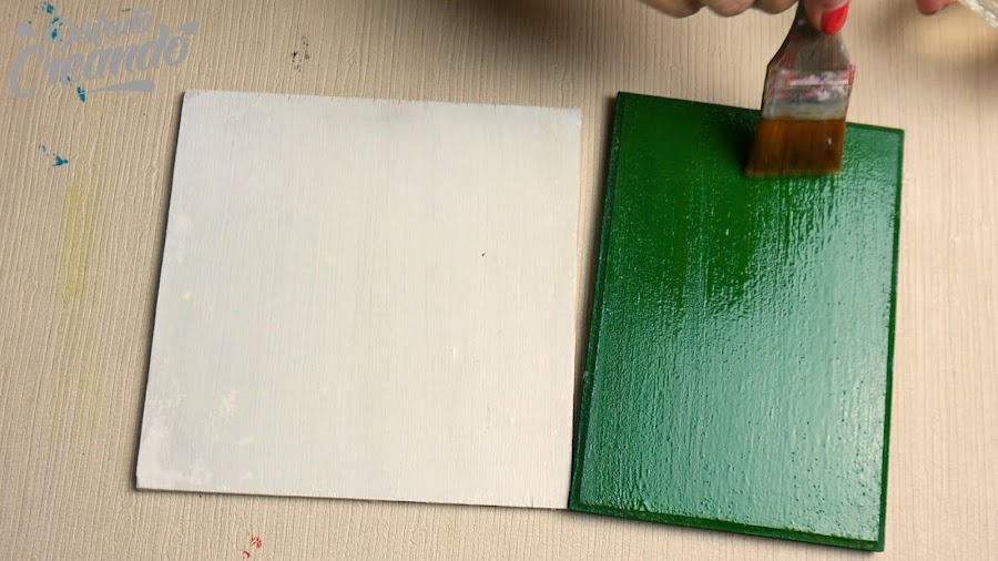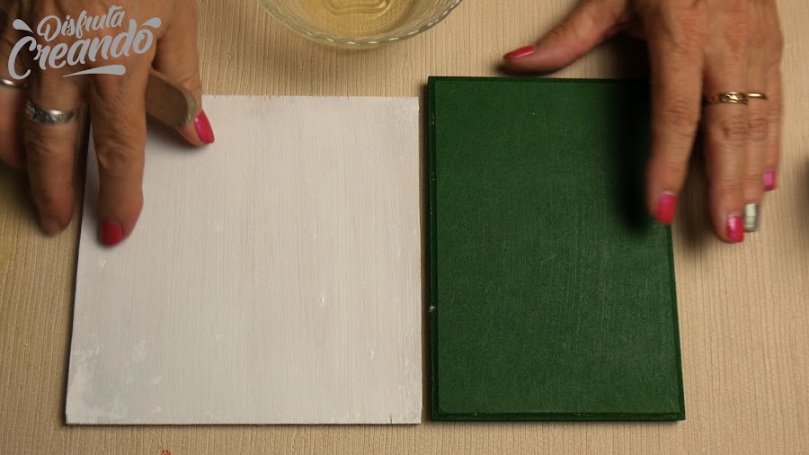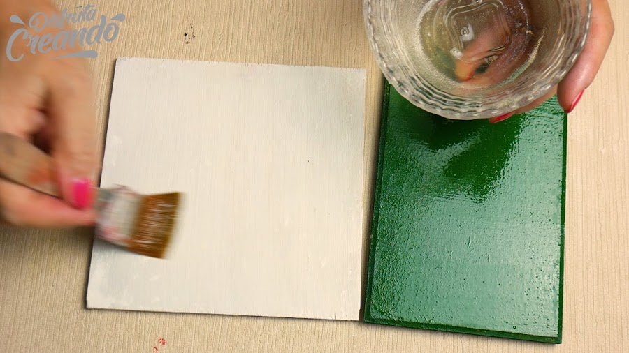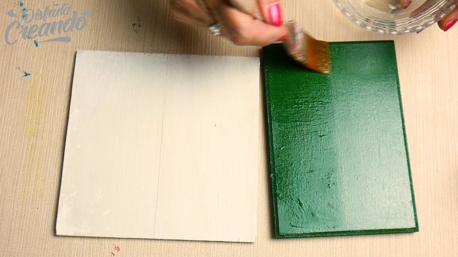 una madera la pinté blanca y la otra verde oscuro para que vean la diferencia de craquelado con distinto color de fondo.