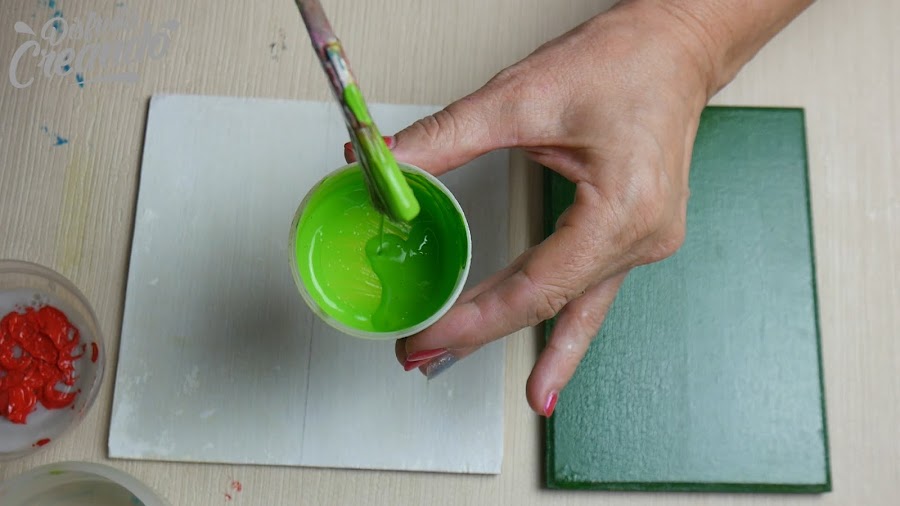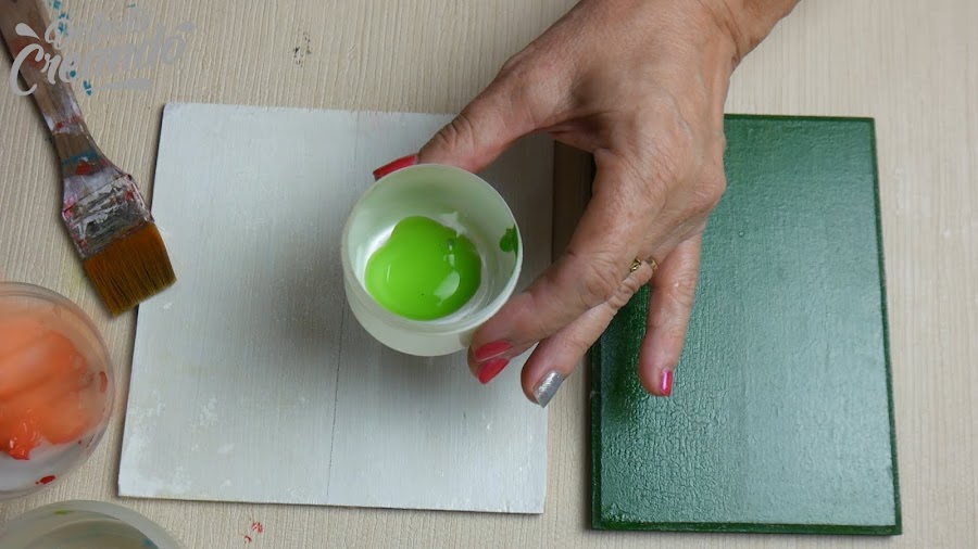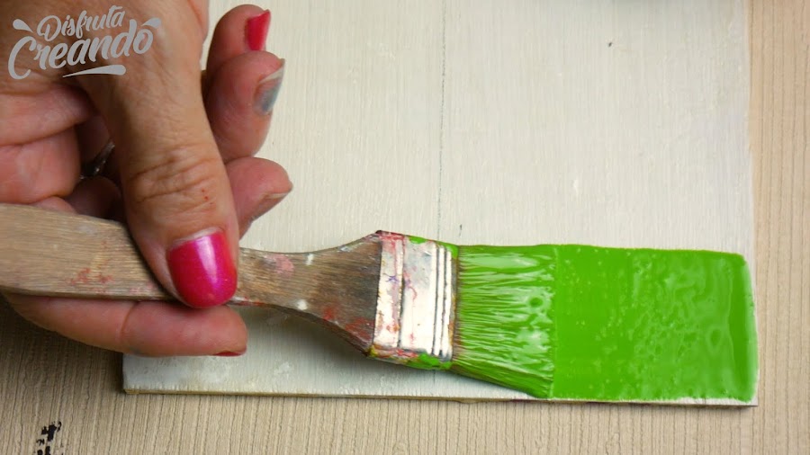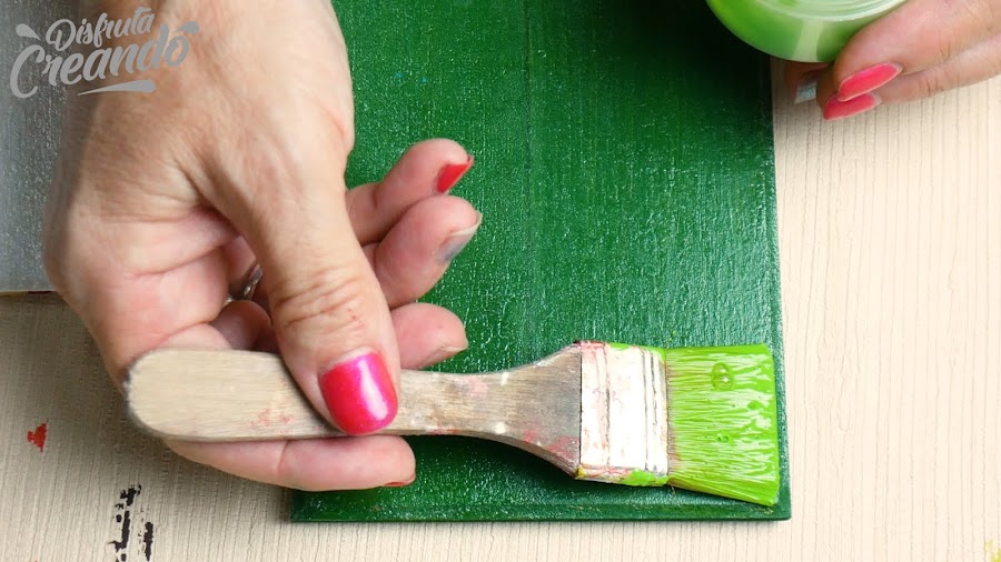 Ya le di 4 manos de clara de huevo, le aplico ahora el verde que me quedó del muestrario, con una pinceleta más chica.
