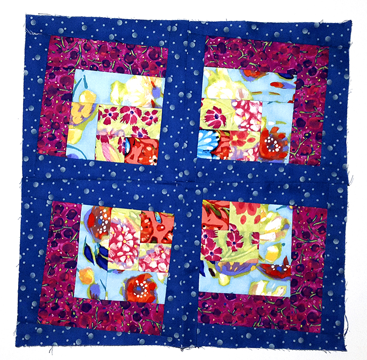 Ara comença la part divertida i esbojarrada. Agafarem cada un dels mini blocs i retallarem de manera que el centre ens quedi desplaçat. Podem girar una mica i a partir d’aquí retallar un quadrat (23); ho fem amb tots. Nosaltres hem retallat primer un i després hem sobreposat els altres i hem fet el mateix tall, però es pot fer cada un diferent, respectant que la mesura del quadrat sigui la mateixa. Disposem els Log Cabin retorçats com veieu al dibuix (24) i els unim com ja és habitual: cosim els dos mini blocs de dalt i els dos d’abaix entre ells (25) i, les dues tires obtingudes(26), les cosim entre elles (27). Per fi tenim el nostre bloc acabat (28).