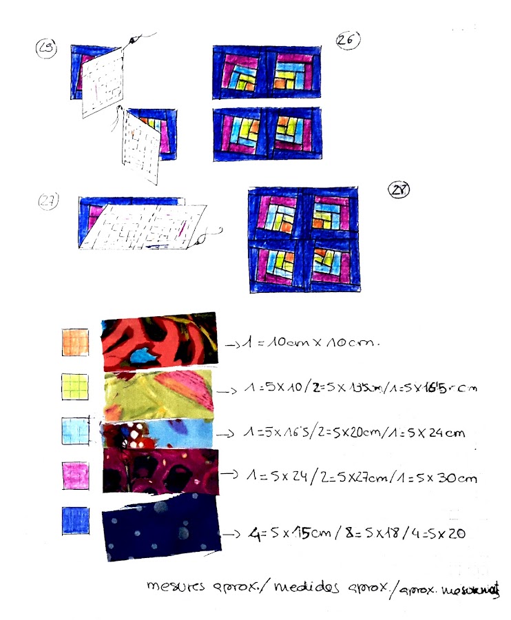 Ahora empieza la parte divertida y alocada. Cogeremos cada uno de los mini bloques y recortaremos de forma que el centro nos quede desplazado. Podemos girar un poco y a partir de aquí recortar un cuadrado (23); lo hacemos con todos. Nosotras hemos recortado primero uno y después hemos sobrepuesto los otros y hemos hecho el mismo corte, pero se puede hacer cada uno diferente, respetando que la medida del cuadrado sea la misma. Disponemos los Log Cabin retorcidos cómo veis en el dibujo (24) y los unimos como ya es habitual: cosemos los dos mini bloques de arriba y los dos de abajo entre ellos (25) y, las dos tiras obtenidas (26), las cosemos entre ellas (27). Por fin tenemos nuestro bloqueacabado (28).