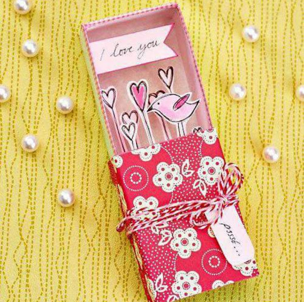 Seguro que alguna vez has visto una caja de cerillos, pero jamás convertida en una hermosa caja de regalo. Así que consigue una y píntala del color que prefieras. Haz lo mismo por dentro, pero que sea de un color que contraste. Ahora puedes pegar stickers y añadir una linda cinta a modo de moño.