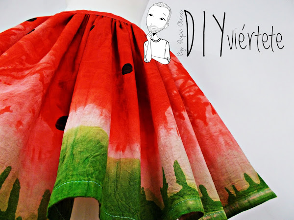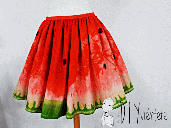 Juntando el amor que siento por la sandía, con el diseño de la Pepefalda (tutorial muy visitado que me ha dado muchas alegrias) he creado, gracias a Tintes Iberia esta falda estampada.