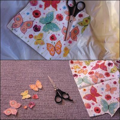 Mientras dejamos secar la pintura, nos ponemos manos a la obra con la decoración de la caja. Yo solo voy a usar unas mariposas y unas florecillas (pocas) porque como lo sobrecargue, acabo cansándome de verlo y sé dónde acabará finalmente la caja. Incluso yo la dejaría tal cual a madera vista. Cada cual a su gusto