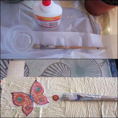 Preparamos 3 partes de cola blanca por una de agua, y a pegar mariposas.