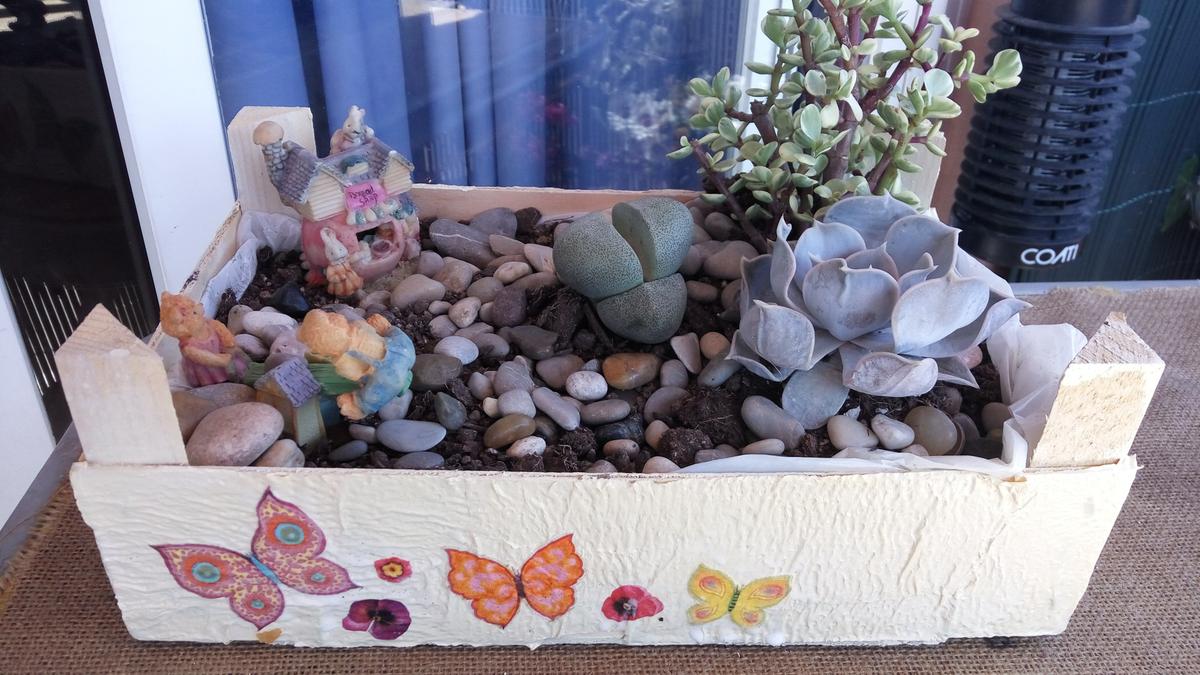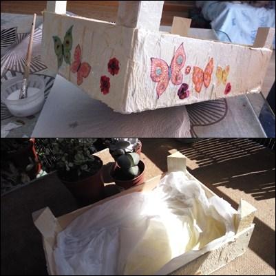 Como podéis observar, se aprecia la rugosidad de la caja (una plasta de papel y cola que salió mal ) pero en realidad, una vez todo seco, queda muy rústico y bonito para exteriores.