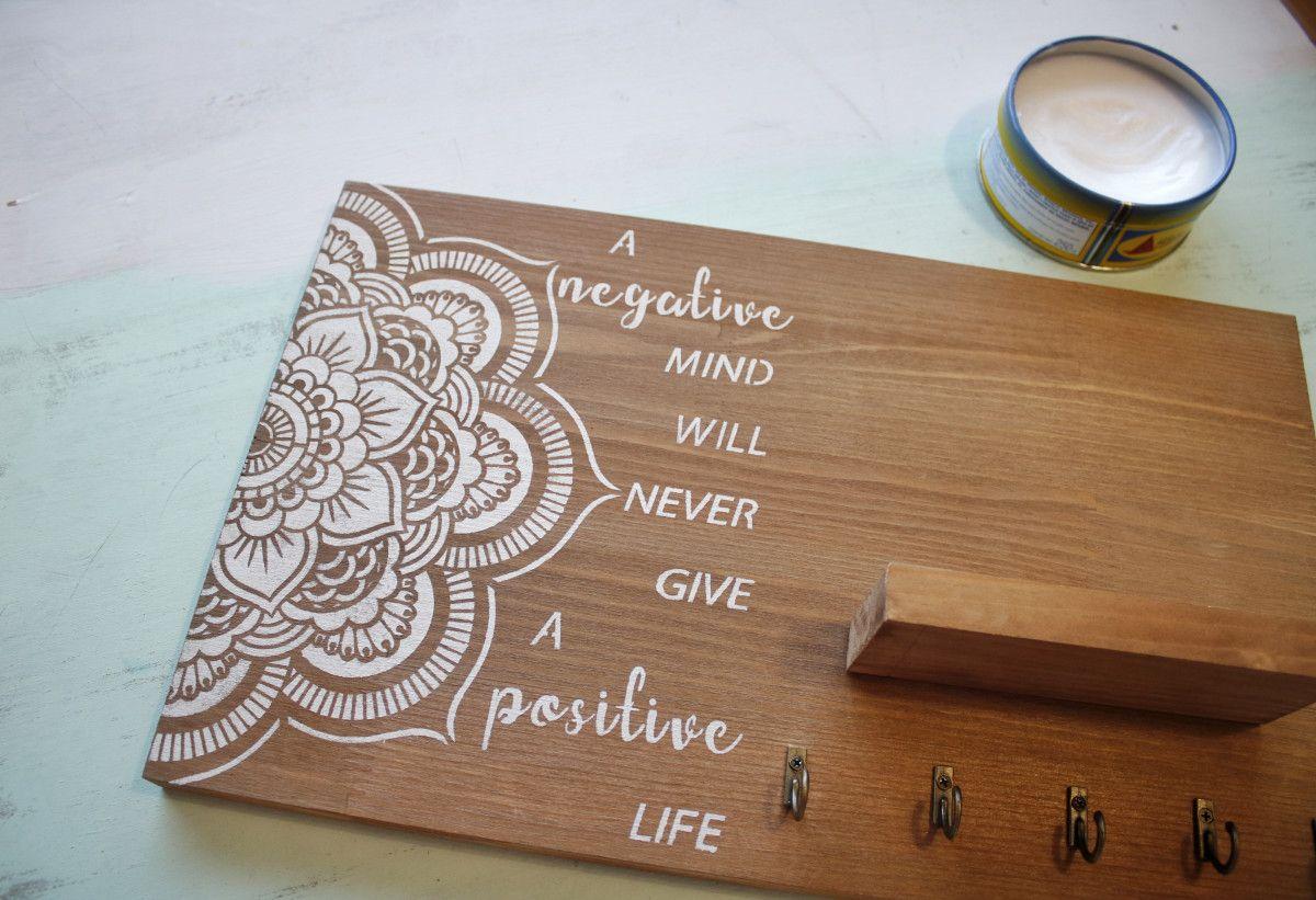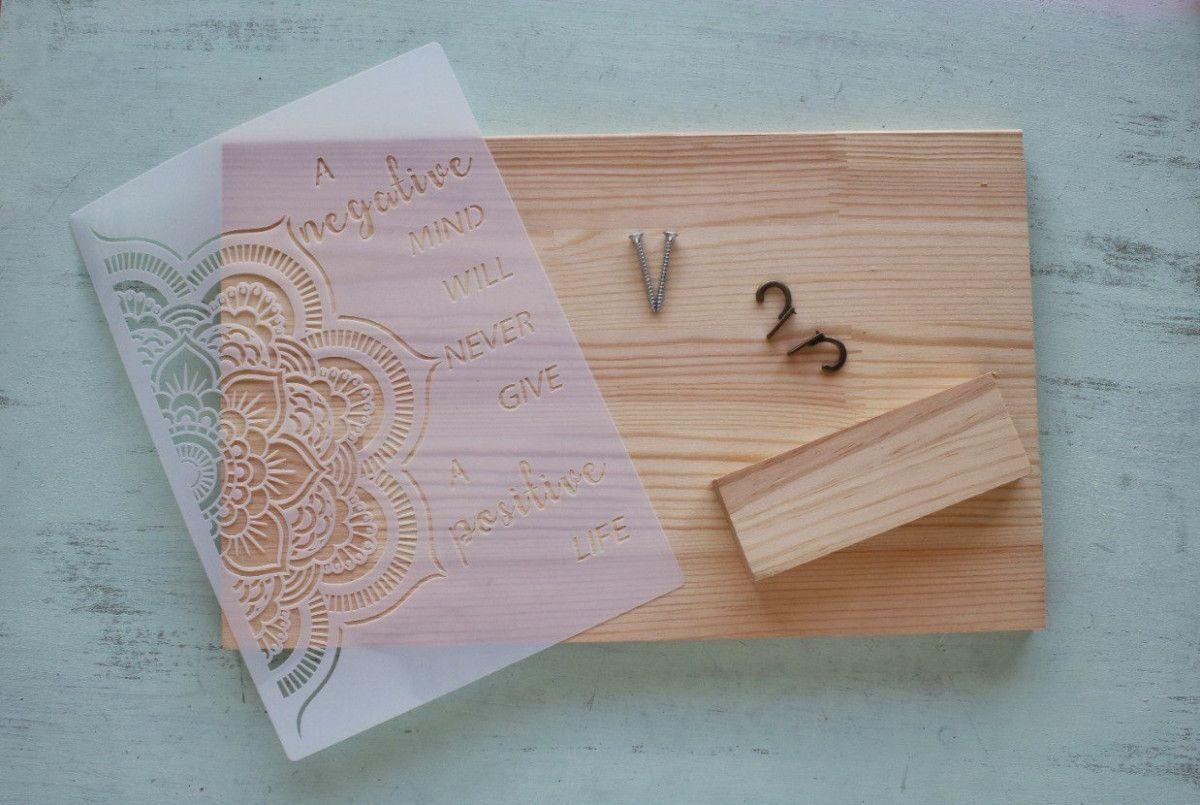 Paso 2 – StencilEste paso es el más creativo. Necesitaremos una plantilla de stencil, pinceles de stencil y pintura al agua. Para mi colgador de bisutería he elegido un stencil con mandala y frase para darle un toque positivo a todas las mañanas.