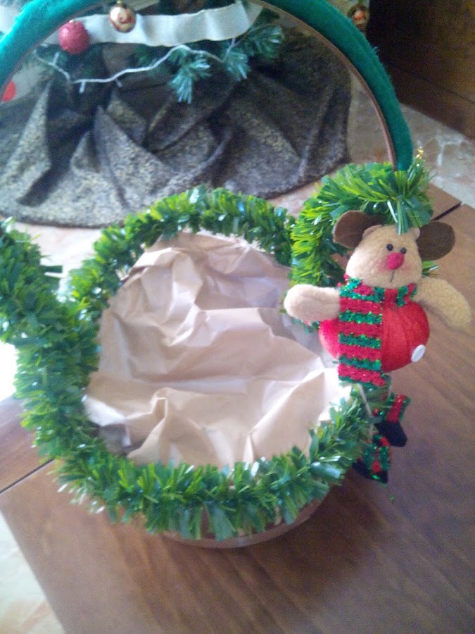 Buscamos o compramos una cesta según el tamaño que queramos hacer, una vez que la tengamos la decoramos con todo lo que nos guste o tengamos en casa. cintas navideñas, bolas de navidad, algún muñequito tan simpático como este hará que quede más chula. y rellenamos el interior de la cesta con papel para que lo que pongamos dentro no quede escondido sino que se vea bonito.