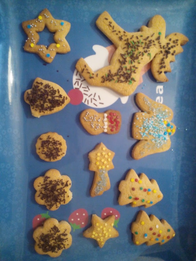Yo he hecho una tanda de galletas de mantequilla, y han salido deliciosas, tanto que las que no iba a colocar en la cesta han volado. Luego las he decorado con fideillos de chocolate o cualquier adornito que tengáis para galletas o bizcochos. El año pasado las hicimos con fondant, pero aunque quedan mucho más vistosas no están tan ricas porque a mi personalmente el fondant no me gusta comérmelo. En fin cada uno las puede hacer a gusto.
