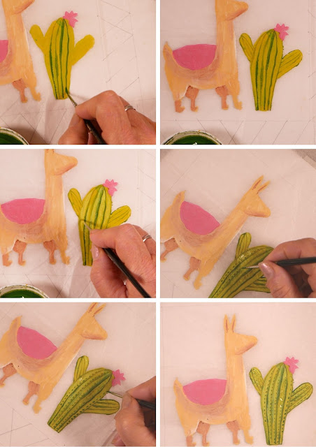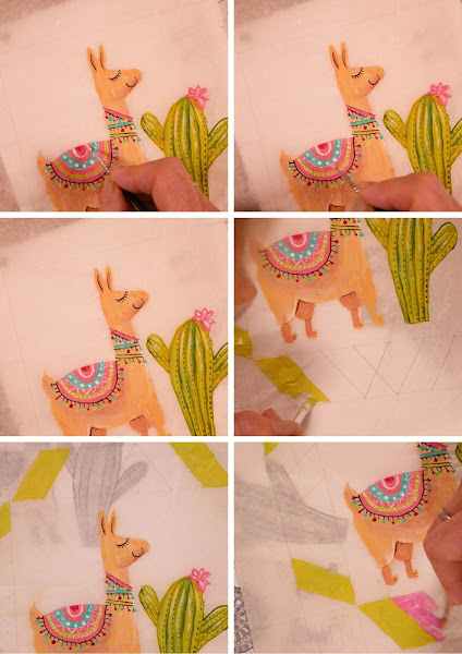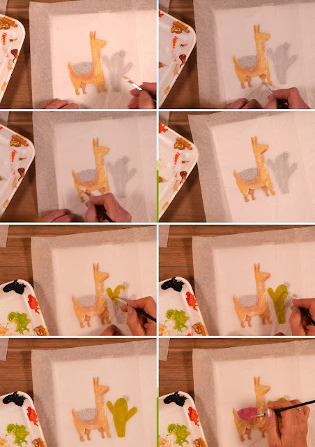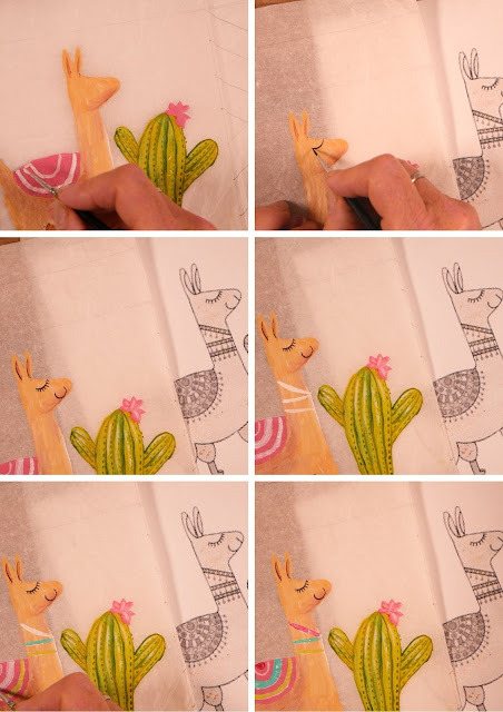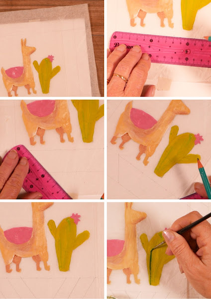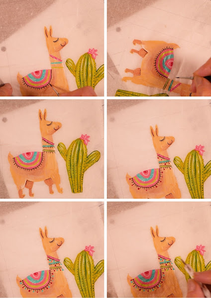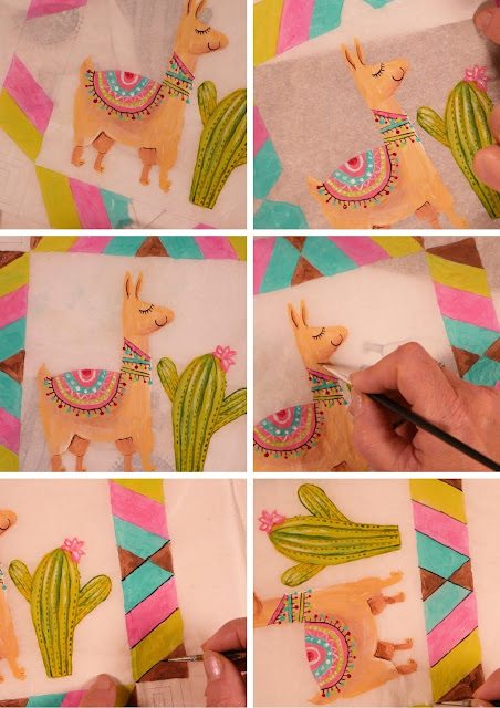 Elegí como motivos unas llamitas o alpacas que se han puesto de moda y además porque son de una zona de América donde se emplean muchísimos colores y se visten éstos animalitos con muchos adornos.