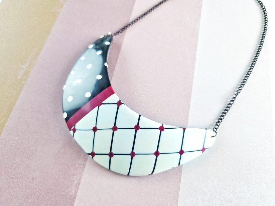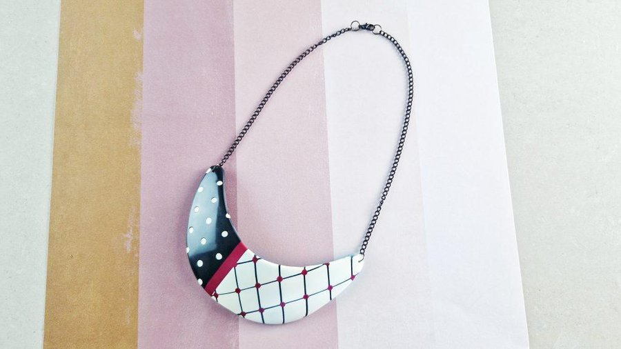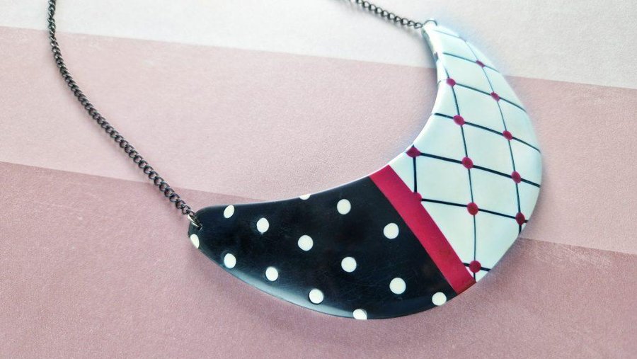 En el tutorial de arcilla polimérica de hoy te enseño cómo he hecho este original collar babero que combina el blanco y el negro con un toque de acento en magenta, combinando un estampado tipo capitoné con estampado de lunares.¿Te gusta? Con esta técnica, que consiste en combinar varias láminas de arcilla y bruñir hasta que desaparezcan las uniones, se pueden crear miles de estampados diferentes en los colores que quieras.