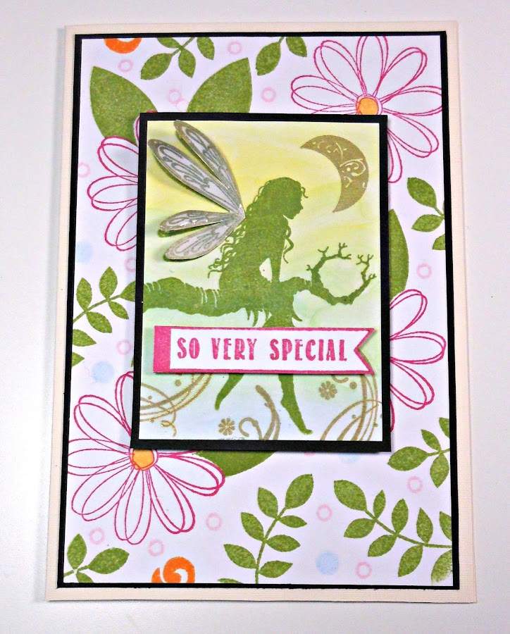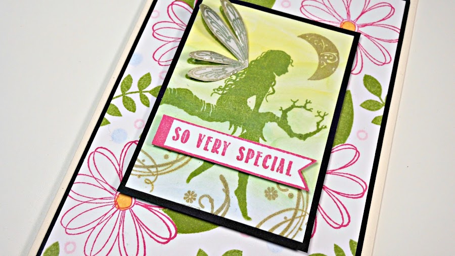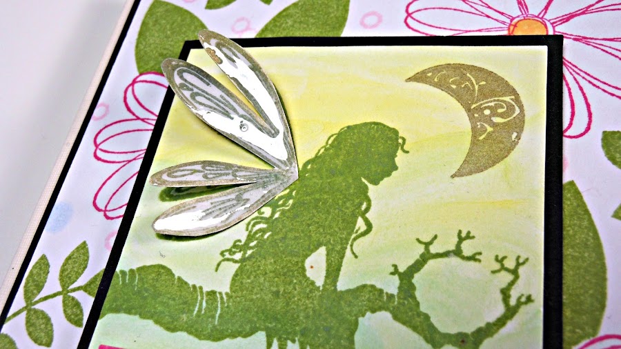 Para la otra capa, que está por encima del fondo, utilicé una cartulina pintada con acuarelas. Estampé una hadita y la acompañe de la luna, filigranas y el sentimiento. Todos elementos de kits diferentes de sellos. Nadie se imaginaría que las filigranas son de una colección de Bodas de Inkadinkado.