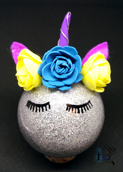 Por otro lado, con pasta de secado al aire, cerámica o lo que queráis (aunque mejor si no pesa) se hace el cuerno del unicornio. Se puede hacer de uno o varios colores. Yo sólo tenía uno pero le he puesto una cuerdecita plateada para darle brillo a juego con la bola.