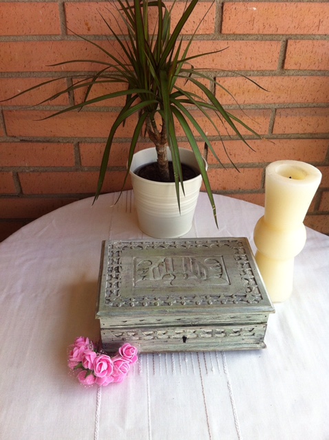 En primer lugar lijé la caja, luego la pinté en tono turquesa claro con pintura acrílica al agua, cuando secó totalmente volví a lijarla. Más tarde la pinté otra vez, en esta ocasión escogí pintura blanca y la dejé secar. El siguiente paso fue lijar la caja insistiendo en algunos lados, sacando el tono turquesa, con el que hemos pintado la caja en primer lugar. Finalizado este paso aplicamos por toda la caja cera con un punto de color que le dará el toque vintage que quería obtener.