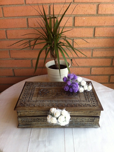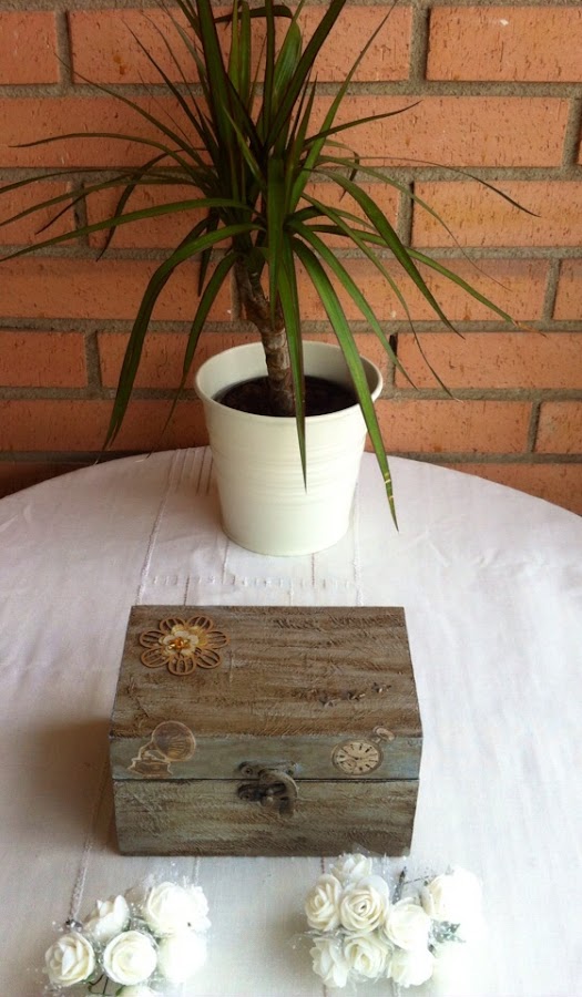 - La primera es un antes y el después de una pequeña caja de madera en la que hemos aplicado distintas técnicas, como el decoupage, envejecido con betún de judea, detalles decorativos y el remate final cera incolora.