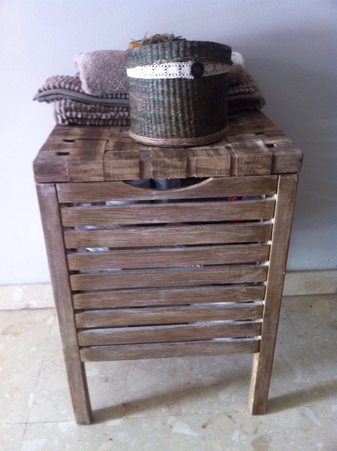 Para terminar os enseño mi último trabajo; tenía unos viejos muebles de teca, una estantería vertical y un taburete baúl que no sabía que hacer con ellos. Pues bien, pensé en el pequeño aseo de casa, una estancia funcional y con poco almacenaje, y decidí que la mejor manera de aprovechar esos muebles sería colocarlos en este aseo. Pero claro antes tendría que darles un toque diferente para que no desentonaran con el resto de complementos de la estancia y este ha sido el resultado.