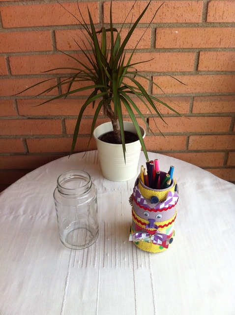 Otro detalle que os voy a mostrar, es como de un simple bote de cristal, podemos conseguir un bonito bote para colocar los colores, simplemente reciclando y utilizando la imaginación.