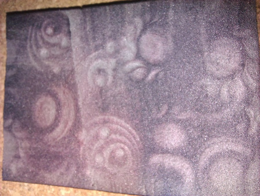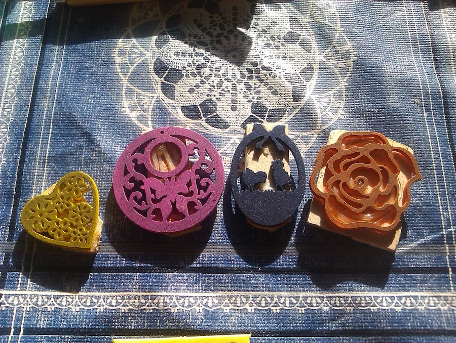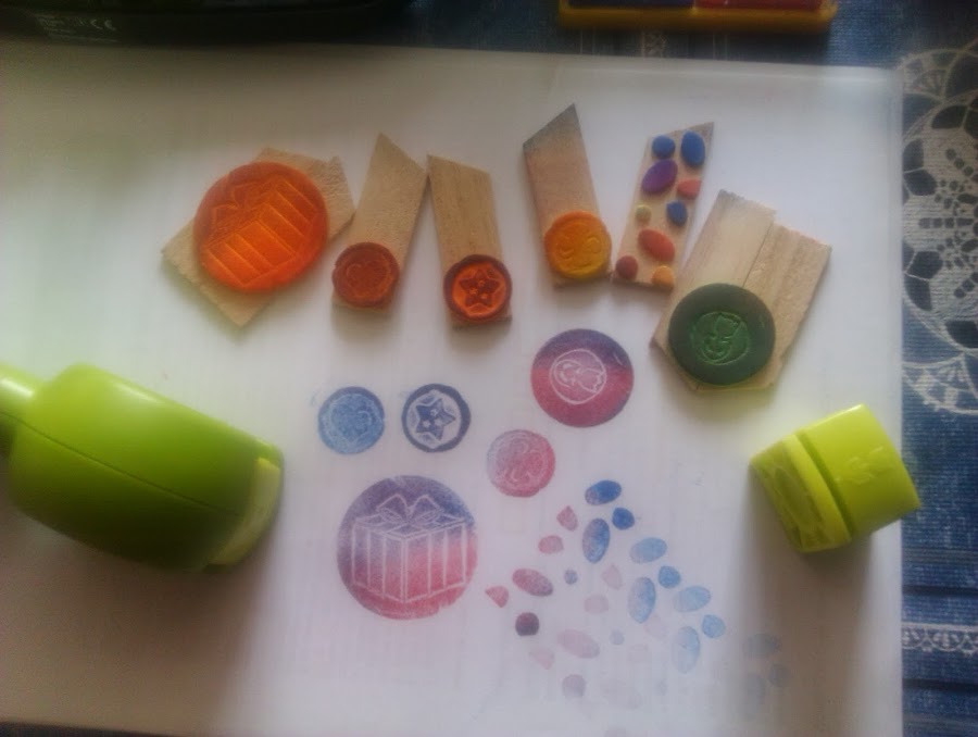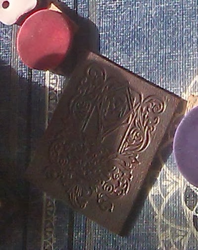 Podemos crear sellos con goma de borrar, vienen unas bien grandes en las tiendas de los ( -_- ) por 0,80â?¬ o bien unas mas especiales y bien grandes que se consiguen en las tiendas especializadas de manualidades. El resultado de mi prueba quedaría como se ve en la parte baja de la imagen. El sello rojo fue calcado de una lámina de decoupage.