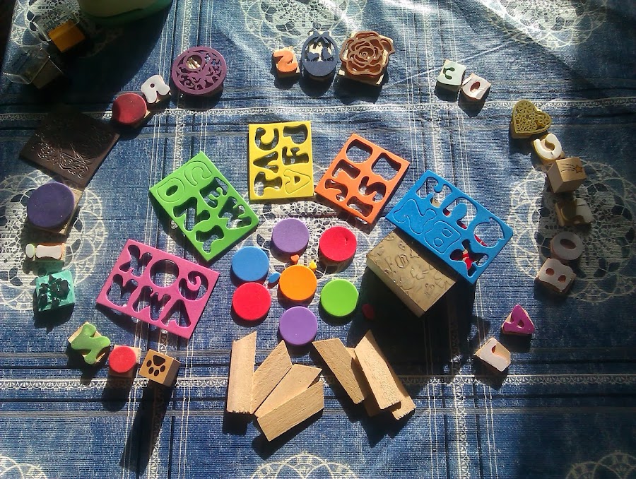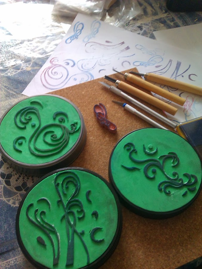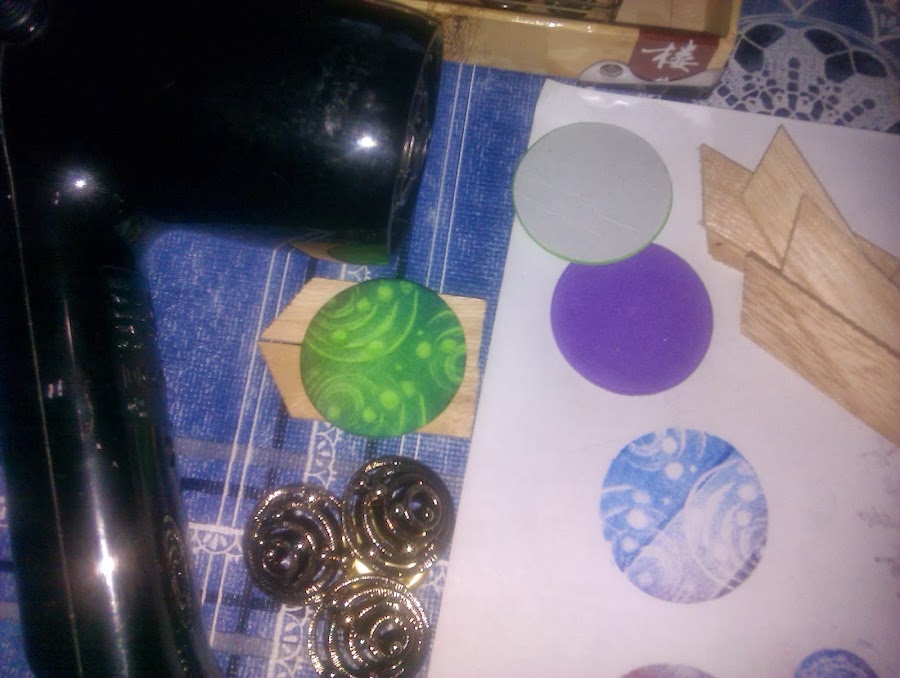 En este caso lo mismo pero sobre goma eva fina con botones amontonados. Como soporte para el sello reciclé las cuñas que vienen para tensar los lienzos.