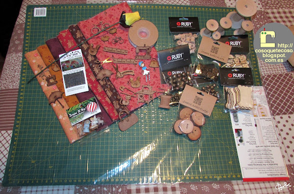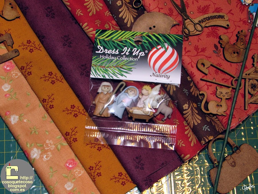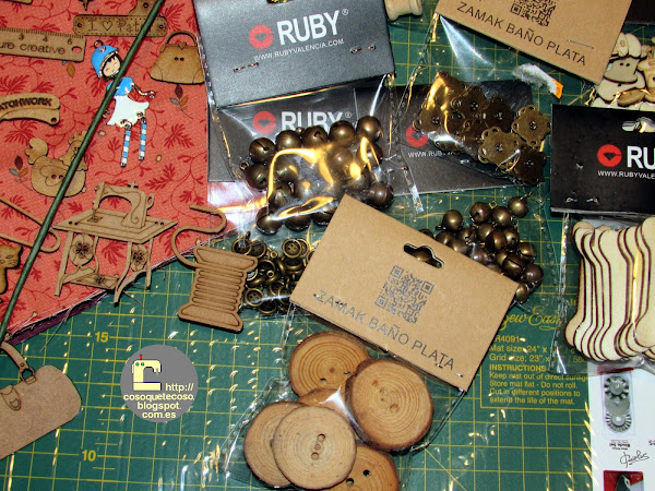Encima de las telas podéis ver unas agujas laneras, me compré el año pasado el hilo de lana y este año las agujas (es lo que tiene la crisis), también podéis ver unos botones con mucho glamour: de cinta métrica, de gatos, gallinas, bicicletas, imperdibles, bolsos, máquinas de coser....