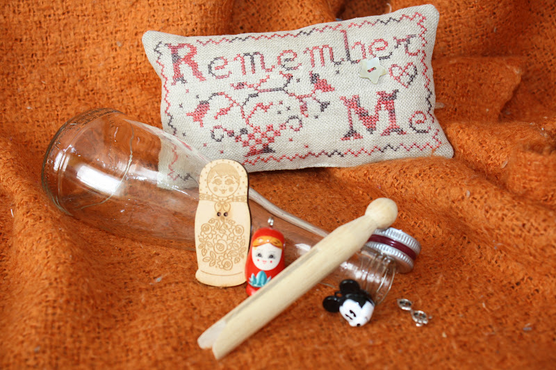 El lote venía completito, con una de las ya famosas pincitas, un botón precioso con una MatriOska ideal (ya os enseñaré donde puse este verano uno igual y queda ideal), un colgante de gafitas chiquirriquitinas, y el mikey que veis ahí es un cascabel-tirador que ya tengo en mente donde poner.