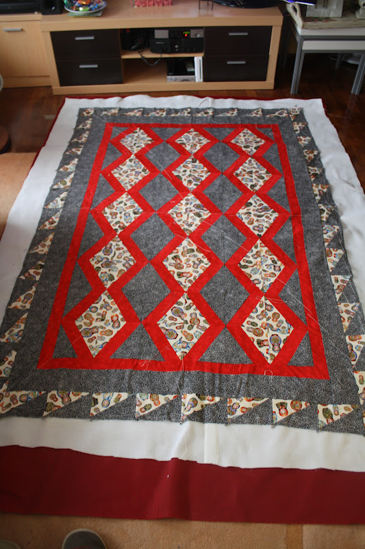Mi hija quería una colcha en color negro y rojo (¿¿tendrá una vena anarca, como la madre??), así que las compré, las he cortado estos días y ale ya esta montada y lista para acolchar, ¡¡que eso será otro caracol por que lo haré a mano y a ratitos¡¡. Aprovecharé que es invierno y mientras acolcho me abrigo.