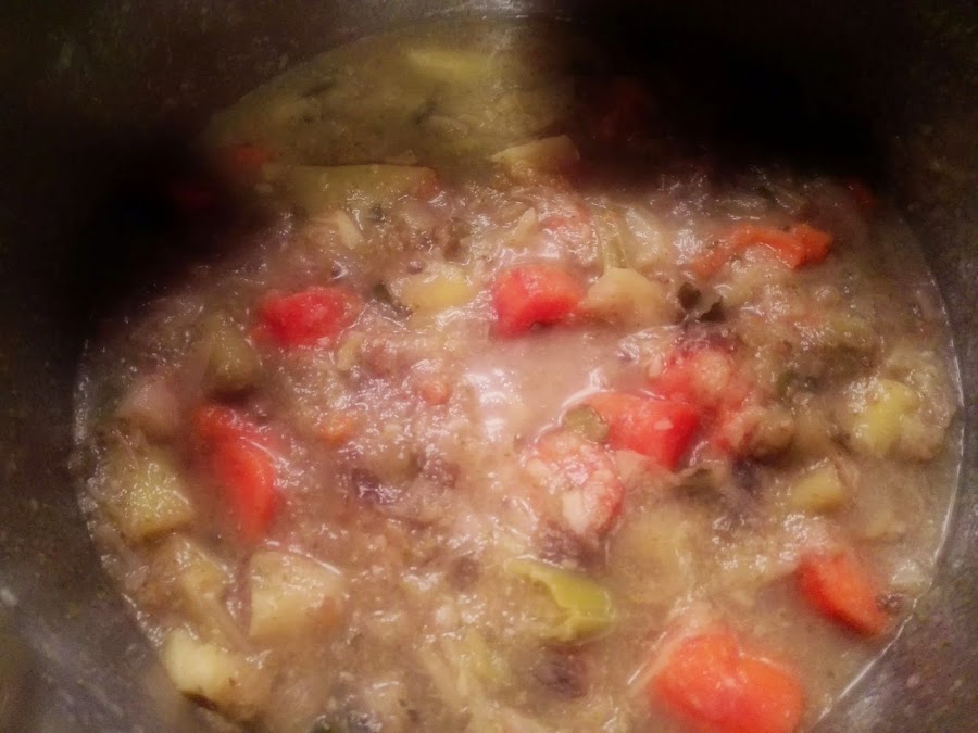 Incorporamos agua hasta cubrir las verduras, la pastilla de caldo, la sal y la pimienta y dejamos cocer unos 25 minutos.