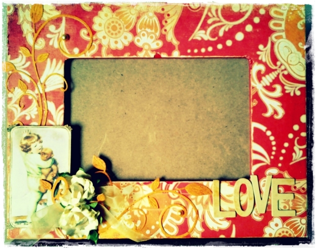 Y el conjunto que forma la decoración ,es una imagen de los últimos papeles de Graphic 45 que son de niños y bebés, muy adecuada al marco por la foto que llevaba, un lazo de organza para que no estuviera demasiado cargado, y unas flores en color neutro junto con unos arabescos con hojitas en naranja ,para que resaltaran del fondo...y un love bien grande, porque los peques ,en la foto se estaban dando un beso.