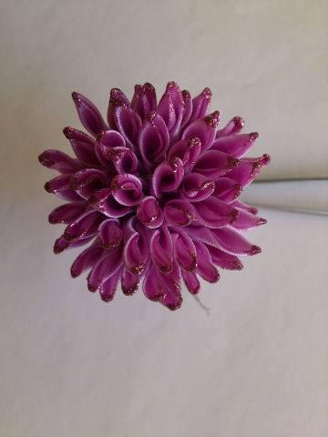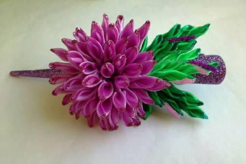 Decoramos el crisantemo de cinta raso con hojas verdes y lo usamos al gusto.