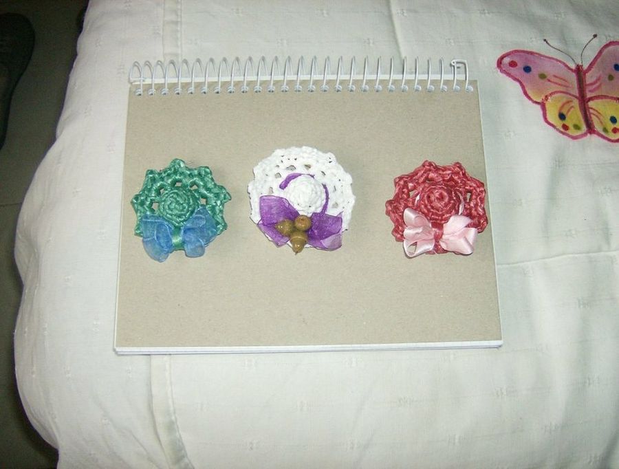 Spliego nos cuenta que aprendió hace poco tiempo y ya hace muchos complementos y adornos, como estos broches. Algunas foreras le preguntaban por el tipo de aguja que se utiliza para tejer bolsas de plástico, y nuestra amiga explicó que no hay que preocuparse buscando una aguja especial: compramos una para lana, si no tenemos, y nos sirve perfectamente.