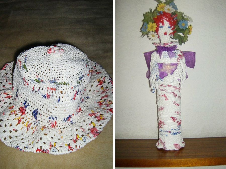 Finalizamos esta simpática galería con sendos trabajos de Egabrense y Spliego. La pamela de Egabrense fue muy admirada en el foro, y destaca por la consabida y favorecedora mezcla de colores. En cuanto a la muñequita de Spliego, nos deja maravilladas por las posibilidades decorativas de las humildes bolsas de plástico.