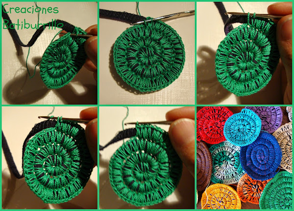 Están hechos sobre tiras de trapillo reciclado de pijamas y camisetas, tejiendo sobre ellas con hilo de crochet nº 8 y ganchillo dama 4. Ya empezareis a conocer los colores que se repiten por el blog. Estas madejas son interminables cuando se usan para pequeños trabajos...qué le vamos a hacer?!. Así todo combina, es la ventaja.