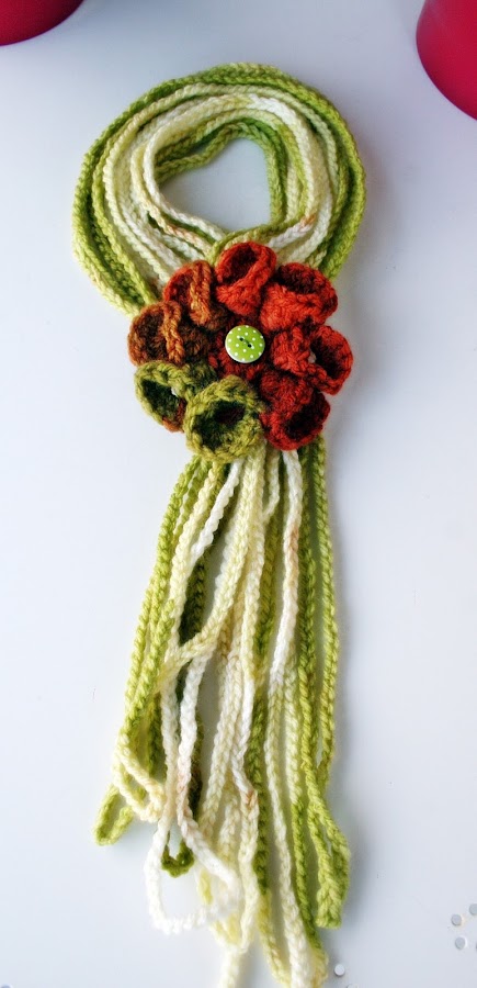 Hice esta flor para la bufanda, el toque el botón de topitos, me encanta!!!