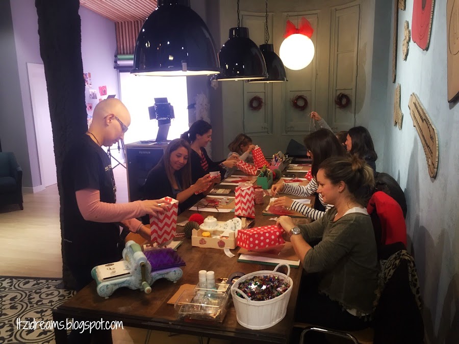 Llegamos a tiempo para poder preparar la mesa para el Taller, decoración de navidad, materiales que usaríamos y unos paquetitos que preparare con el material que parecían regalitos de navidad.