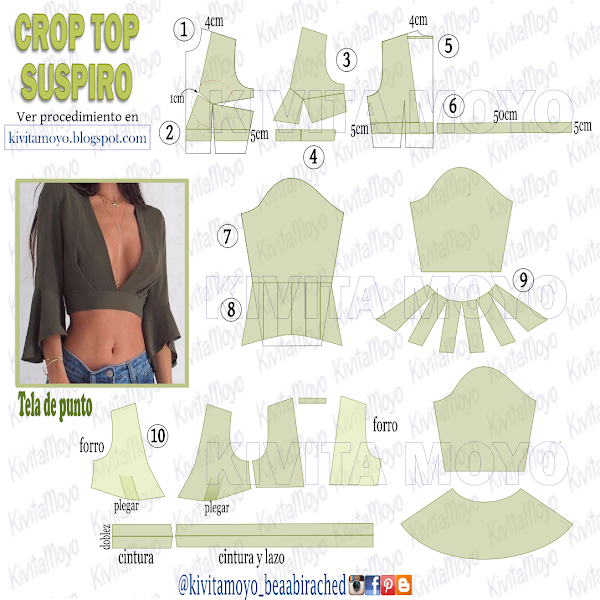 La cintura se convertirá en la parte posterior en un lazo para anudar. Por tener un escote pronunciado tanto adelante como detrás en el escote trasero se coloca una tira para mantener los hombros en su posición natural. Para simplificar el tema de las terminaciones simplemente la prenda se hace doble o sea va forrada, y montan juntas, para hacer el terminado en el bajo con la cintura.