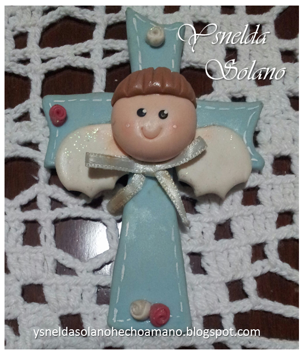 A mi, me corresponde realizar unos recuerditos o recordatorios de ese día tan especial, se trata de unas cruces decoradas con una carita de ángel con imán, para colocar sobre cualquier superficie de metal.