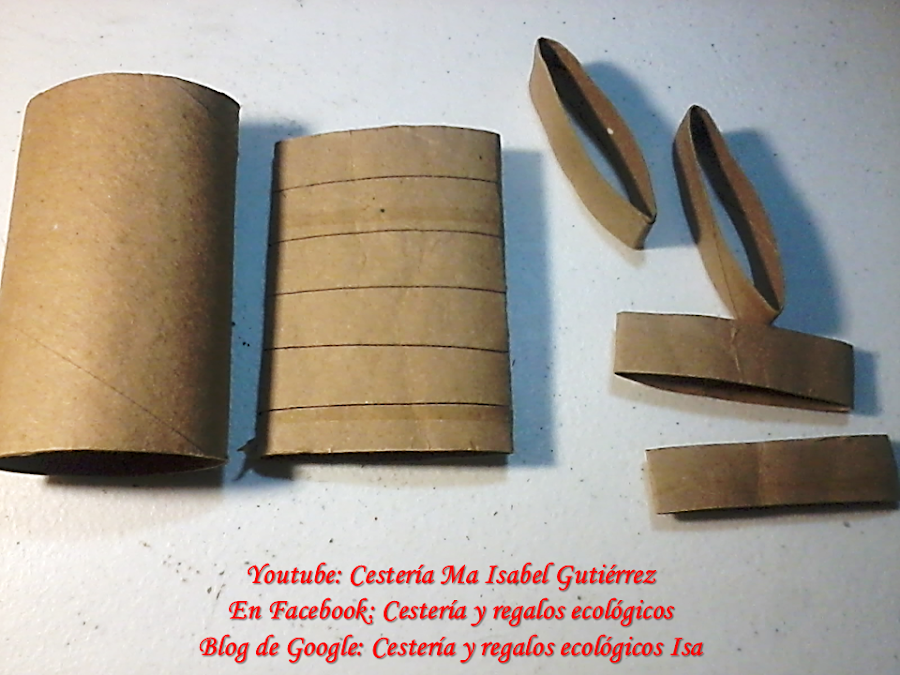 Como primer paso, aplastamos el tubo de cartón higiénico, luego, con una regla, marcamos líneas de un centímetro de ancho y recortamos... consiguiendo estos aros.