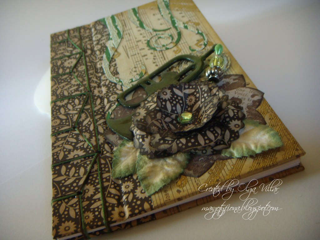 Es un cuaderno con encuadernado japonés, donde se ve claramente las técnicas mezcladas de cartonnage y scrapbooking, que ya es común en mí.