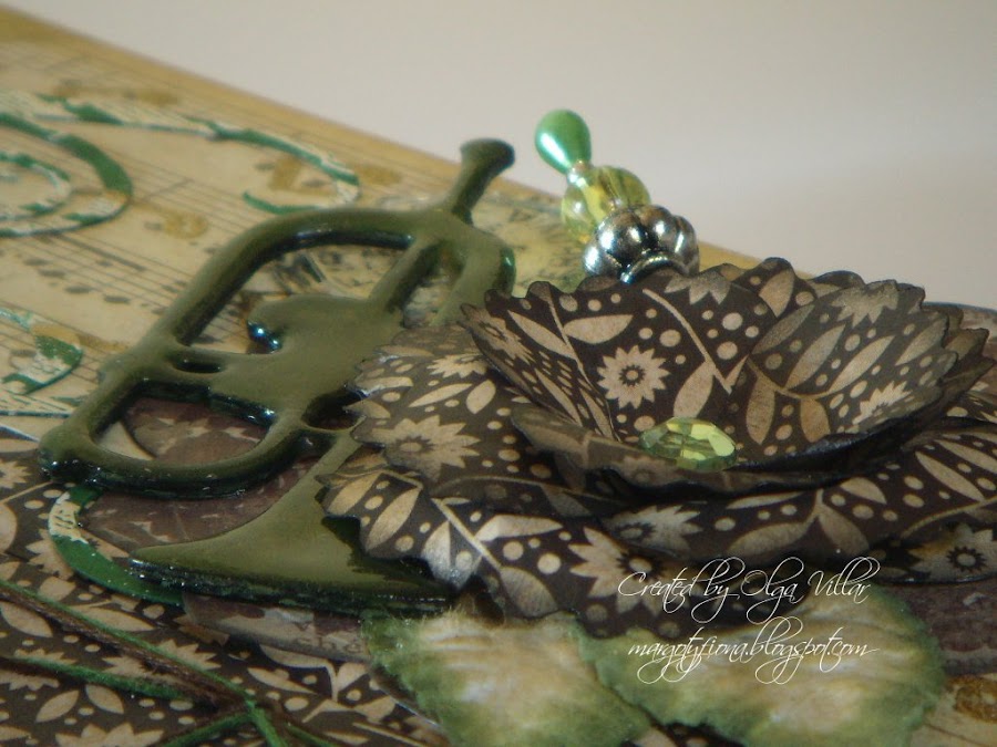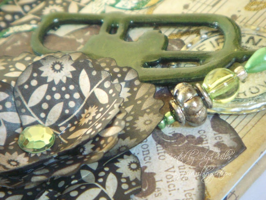 Ya como adorno principal, una flor recortada con la S. Cameo,sobre un troquel con forma de flor de ¿ Nelly Snellen? para la Big shot, con brillantito cerntral de color verde de Prima Marketing.
