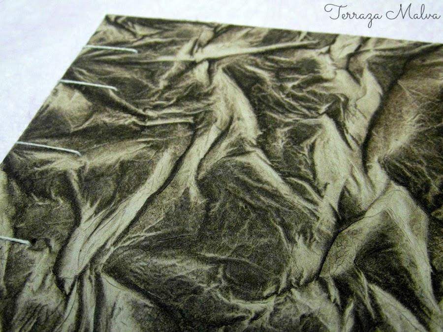 La encuadernación es de tipo copto, que permite una apertura completa del cuaderno y mayor comodidad a la hora de utilizar para dibujar. El papel artesanal utilizado para la cubierta tiene una textura arrugada fantástica, que me recuerda además por el color al cuero viejo y usado.