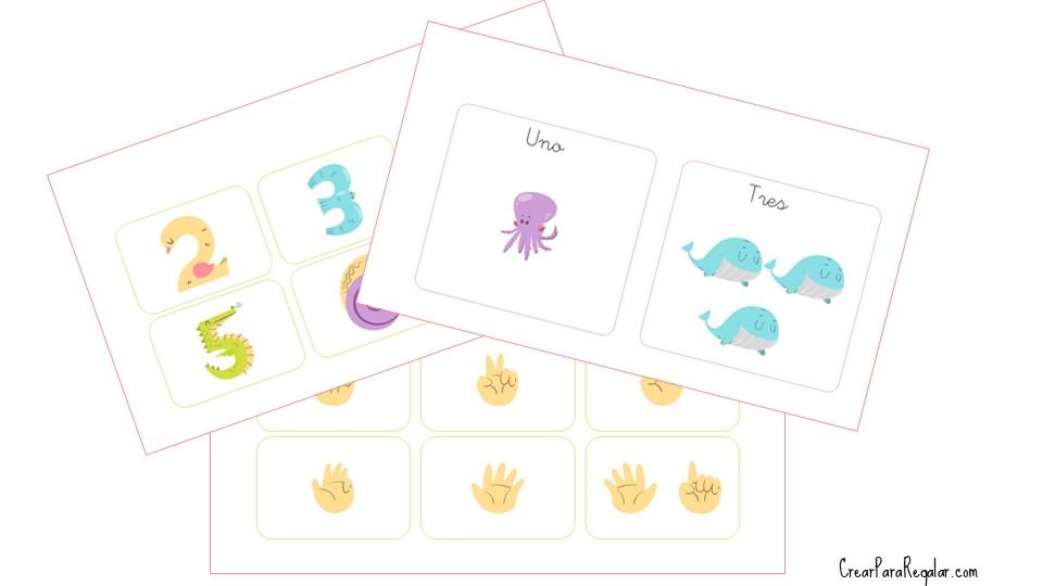 Tarjetas con un conjunto de gestos con las manos para contar, los números del 1 al 10 y Flash Cards con animales.