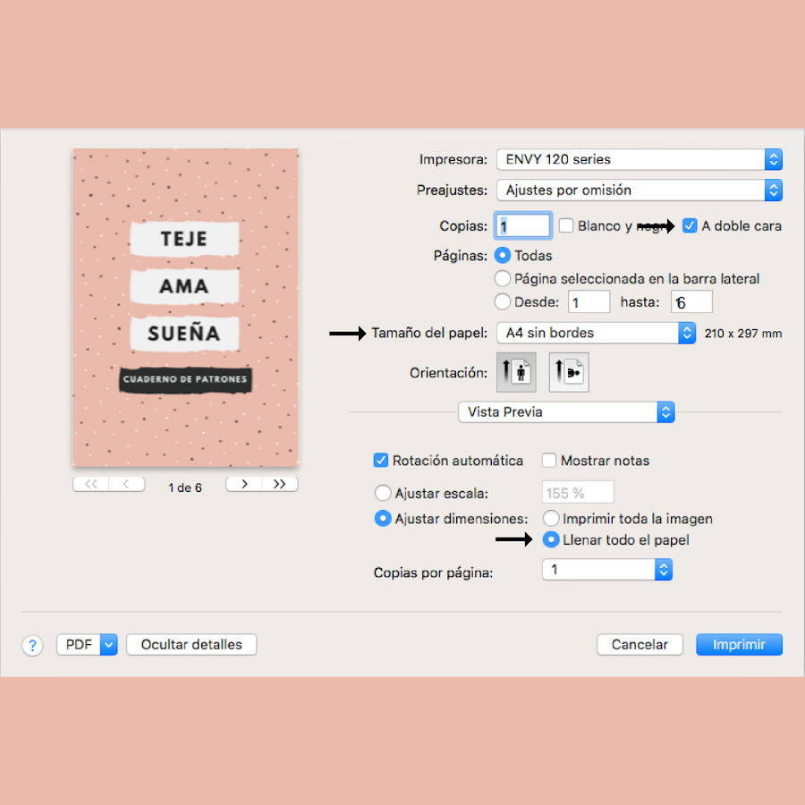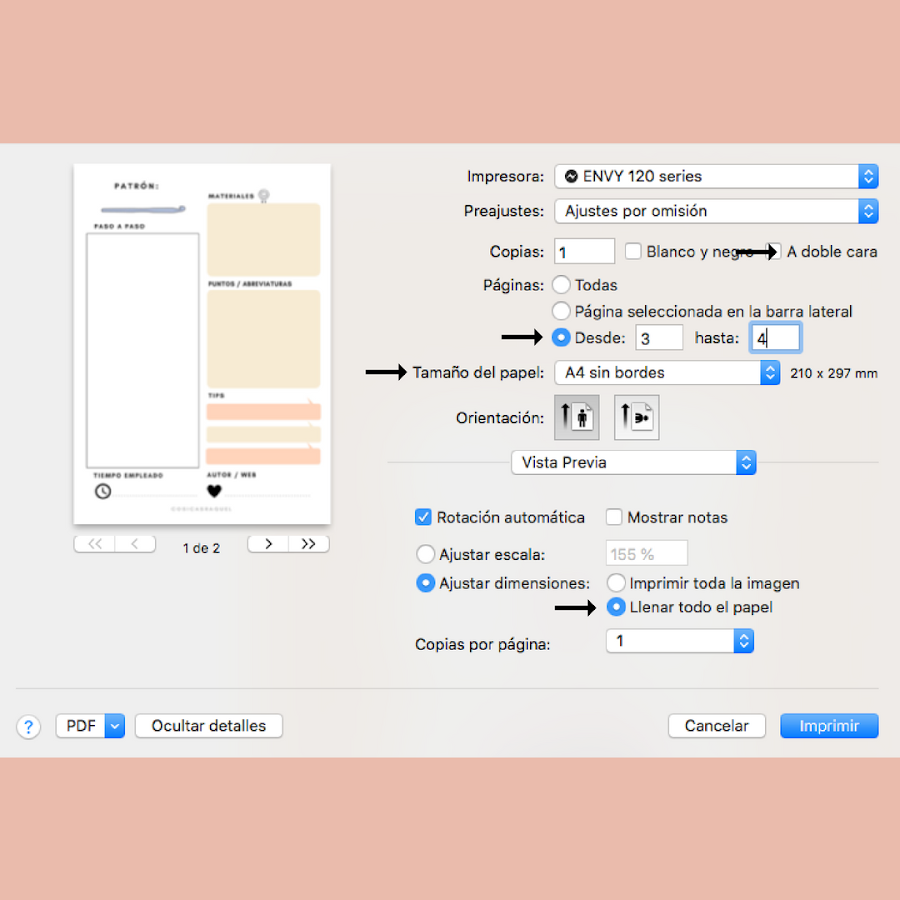 Luego para sacar más hojas de patrones pon el número de copias que quieras sacar, a doble cara, desde la 3 hasta la 4, A4 sin bordes, llenar todo el papel.